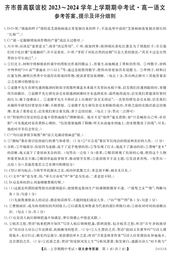 黑龙江省齐齐哈尔市2023-2024学年高一上学期10月期中考试语文答案