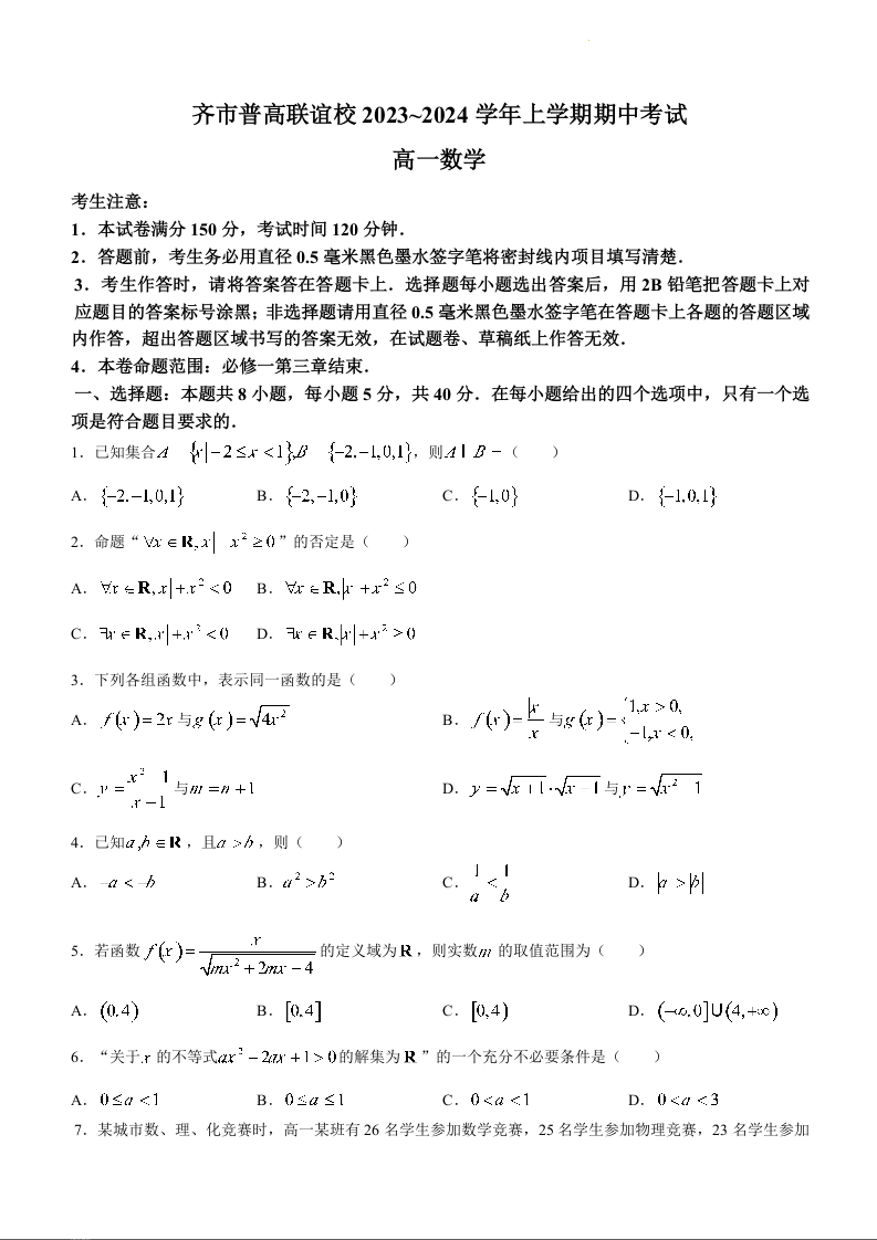 黑龙江省齐齐哈尔市2023-2024学年高一上学期10月期中考试数学+答案