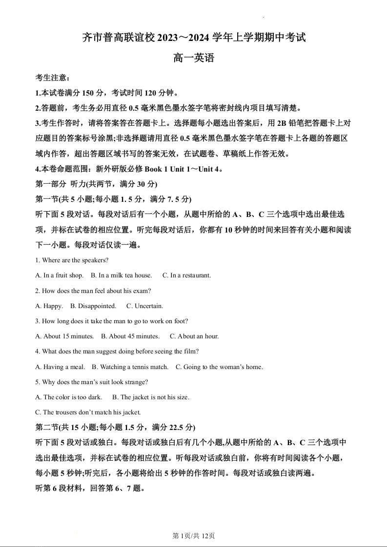 黑龙江省齐齐哈尔市2023-2024学年高一上学期10月期中考试英语(原卷版)