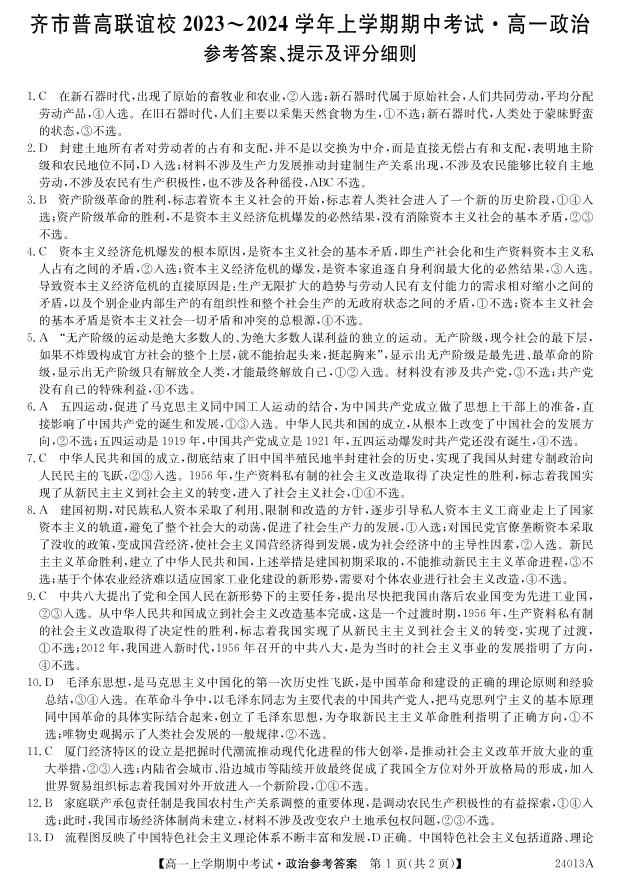 黑龙江省齐齐哈尔市2023-2024学年高一上学期10月期中考试政治答案
