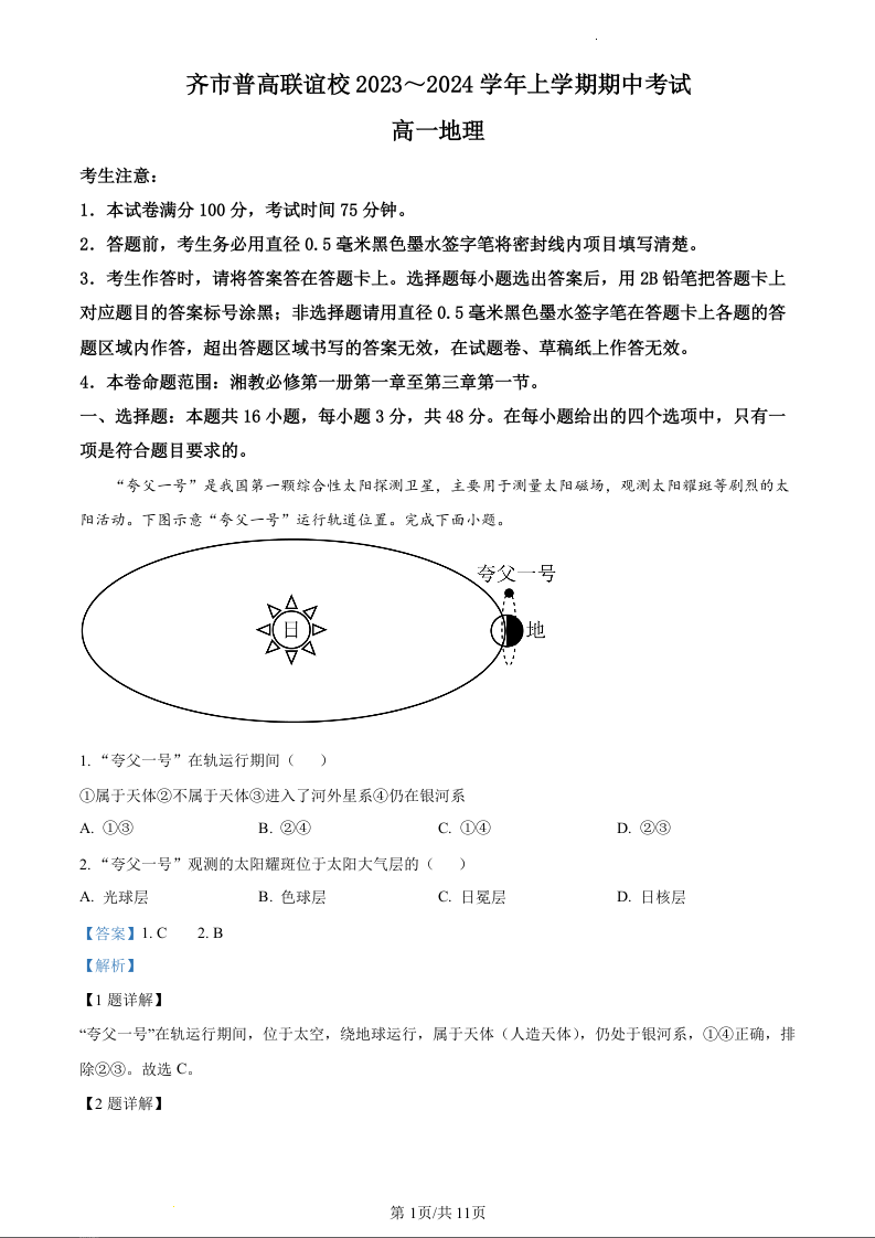 黑龙江省齐齐哈尔市2023-2024学年高一上学期10月期中考试地理(精品解析版)