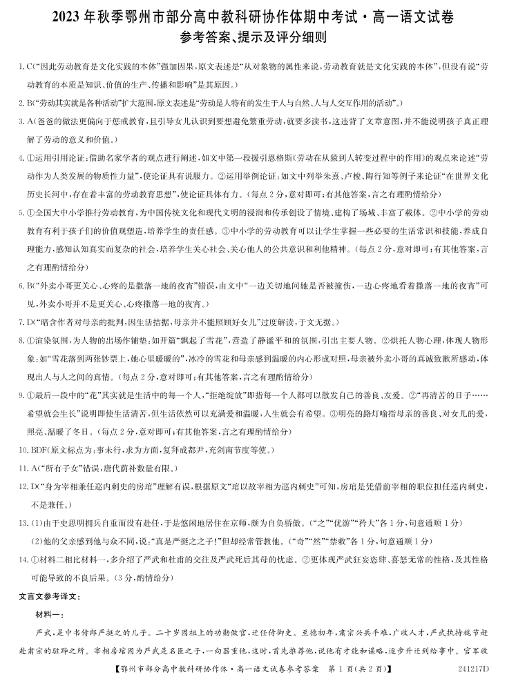 湖北省鄂州市部分高中协作体2023-2024学年高一上学期11月期中考试语文答案