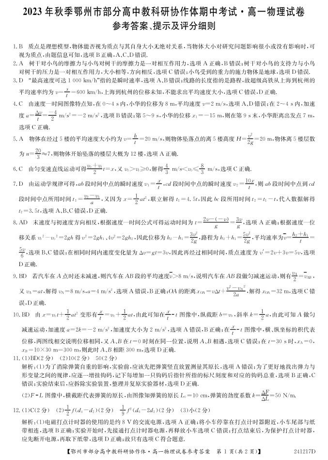湖北省鄂州市部分高中协作体2023-2024学年高一上学期11月期中考试物理答案