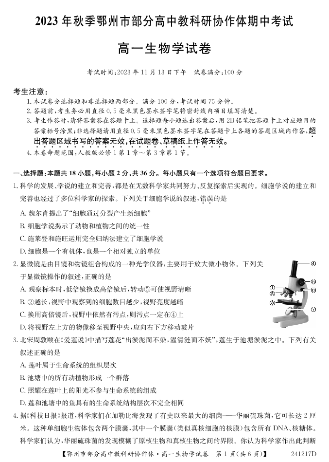 湖北省鄂州市部分高中协作体2023-2024学年高一上学期11月期中考试生物