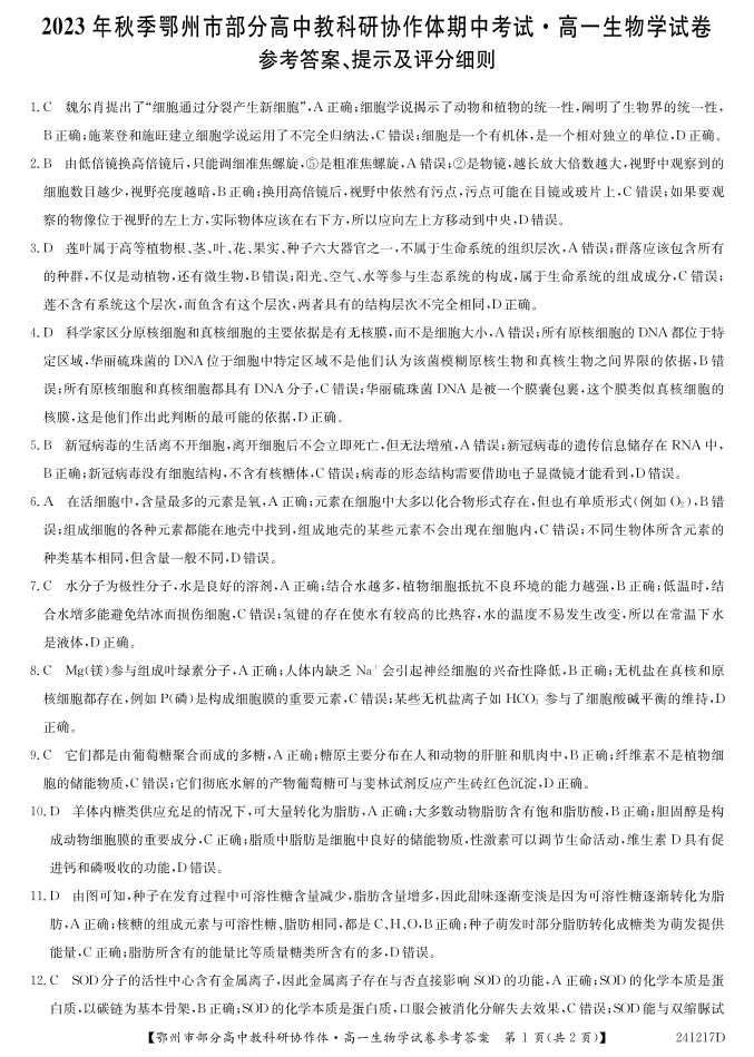 湖北省鄂州市部分高中协作体2023-2024学年高一上学期11月期中考试生物答案