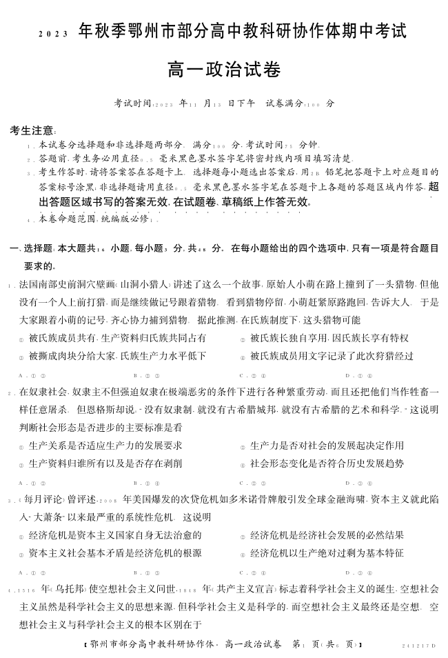 湖北省鄂州市部分高中协作体2023-2024学年高一上学期11月期中考试政治