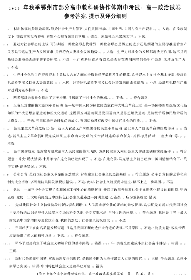 湖北省鄂州市部分高中协作体2023-2024学年高一上学期11月期中考试政治答案