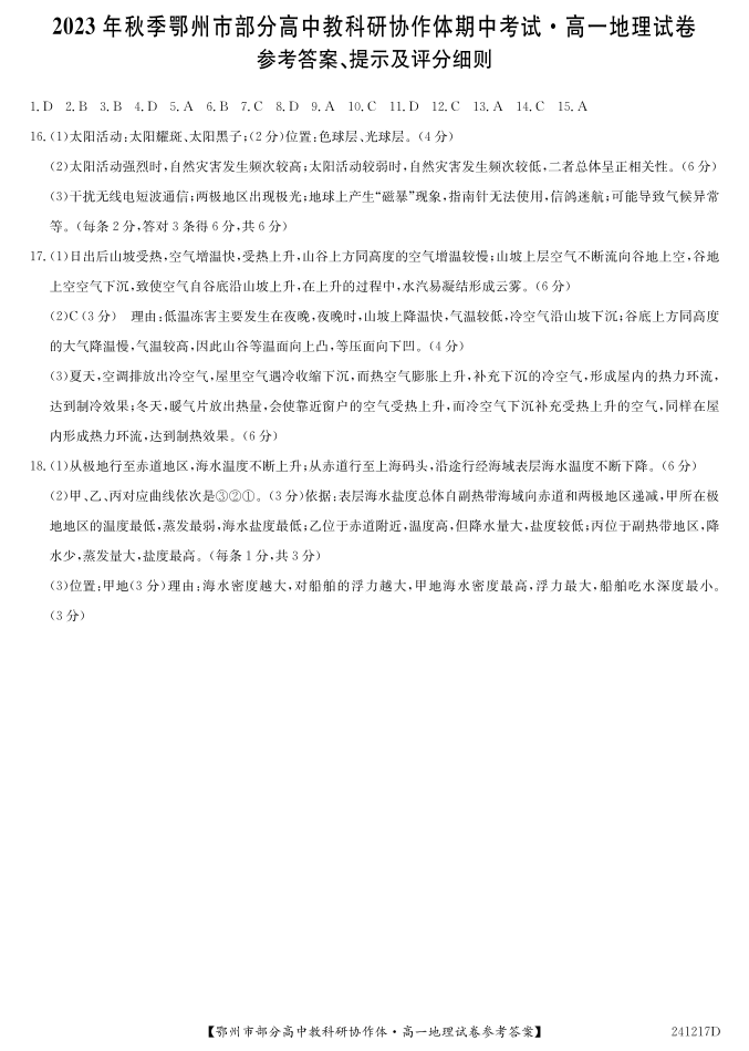 湖北省鄂州市部分高中协作体2023-2024学年高一上学期11月期中考试地理答案