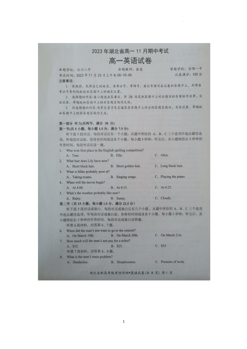 湖北省新高考联考协作体2023-2024学年高一上学期期中考试英语