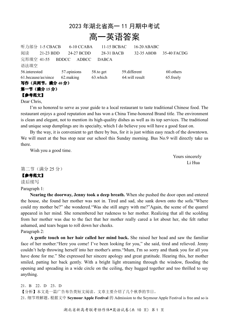 湖北省新高考联考协作体2023-2024学年高一上学期期中考试英语答案