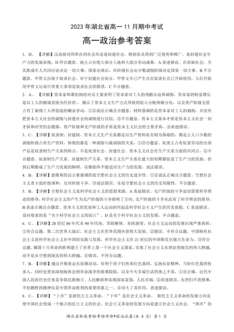 湖北省新高考联考协作体2023-2024学年高一上学期期中考试政治答案