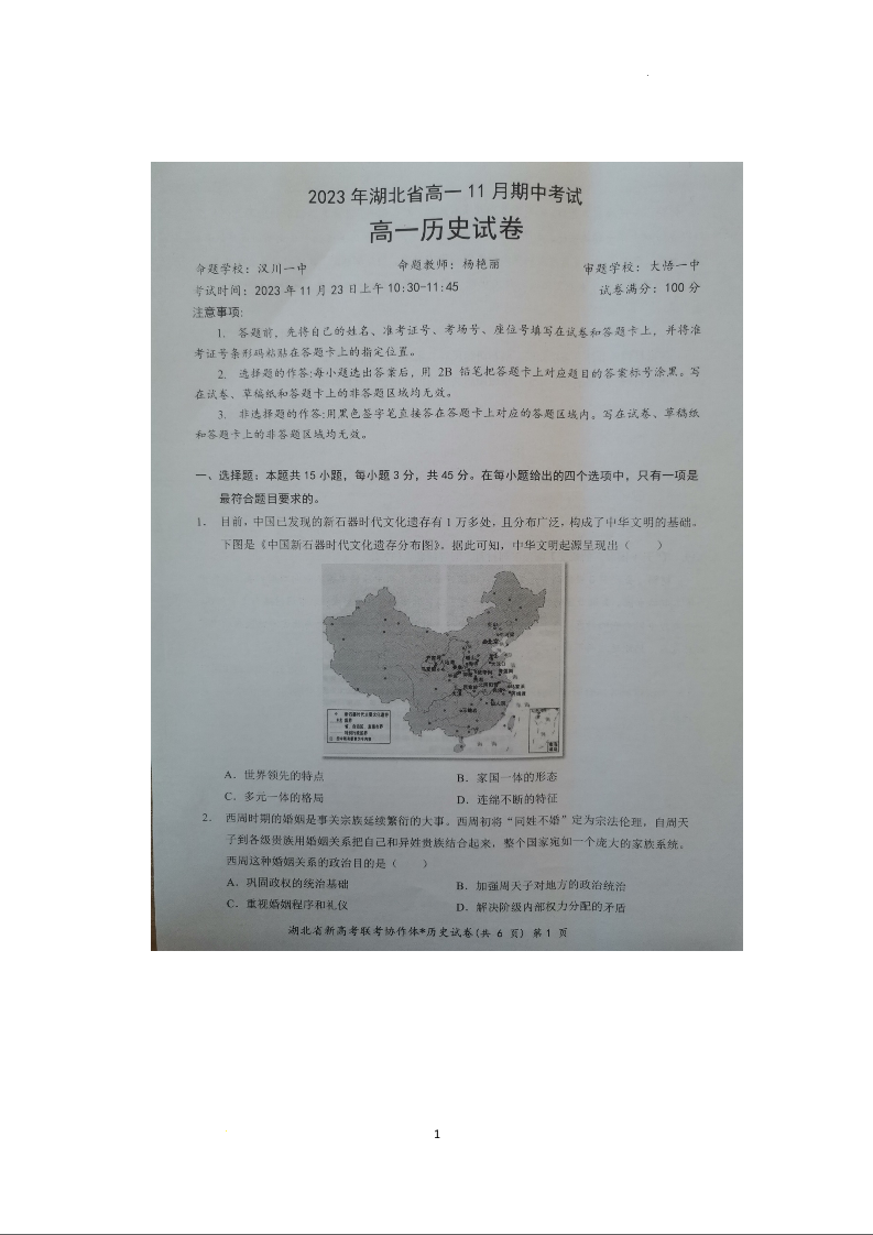 湖北省新高考联考协作体2023-2024学年高一上学期期中考试历史