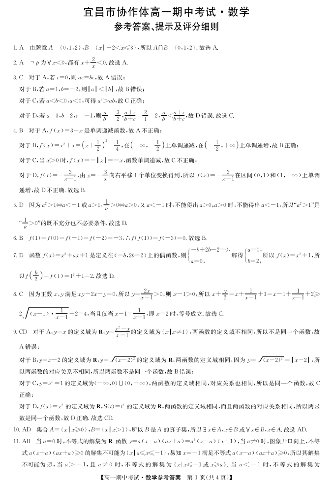 湖北省宜昌市协作体2023-2024学年高一上学期期中考试数学答案