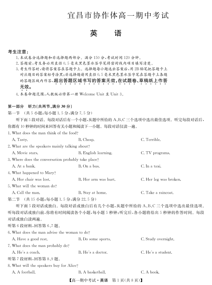 湖北省宜昌市协作体2023-2024学年高一上学期期中考试英语
