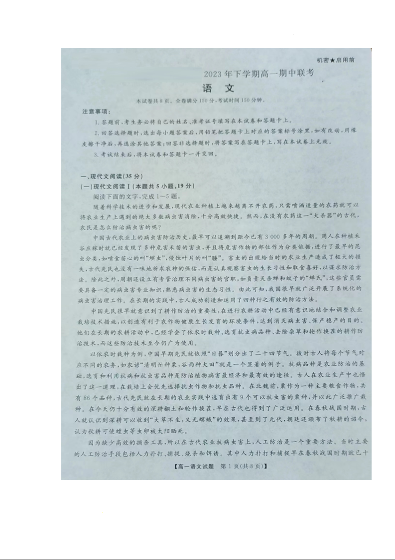 湖南省部分校2023-2024学年高一上学期期中联考语文