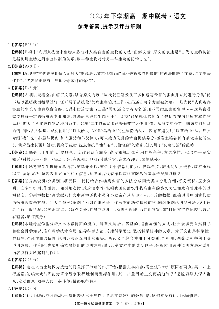 湖南省部分校2023-2024学年高一上学期期中联考语文答案