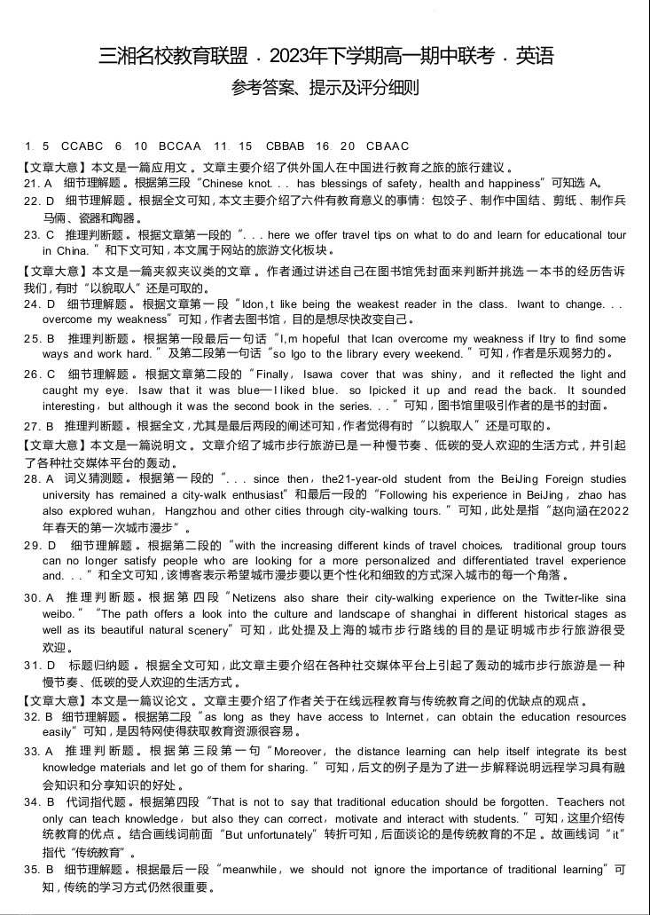 湖南省部分校2023-2024学年高一上学期期中联考英语答案