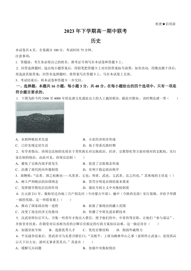 湖南省部分校2023-2024学年高一上学期期中联考历史+答案
