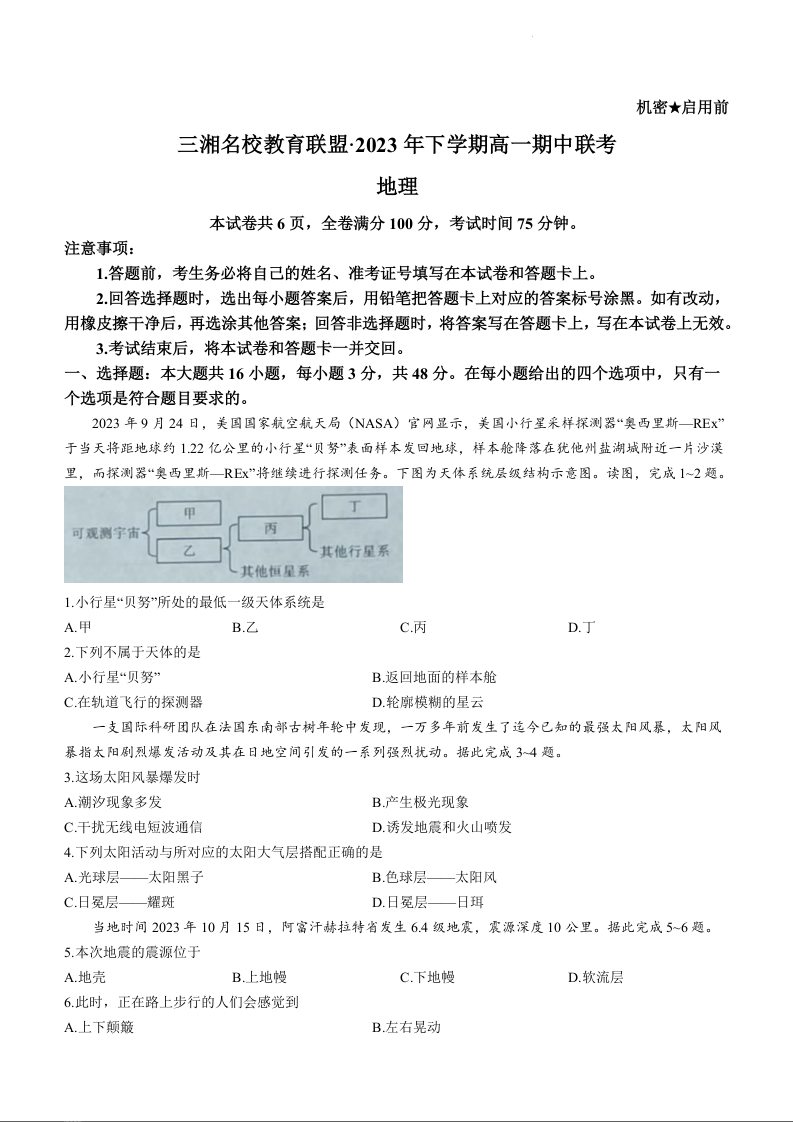 湖南省部分校2023-2024学年高一上学期期中联考地理