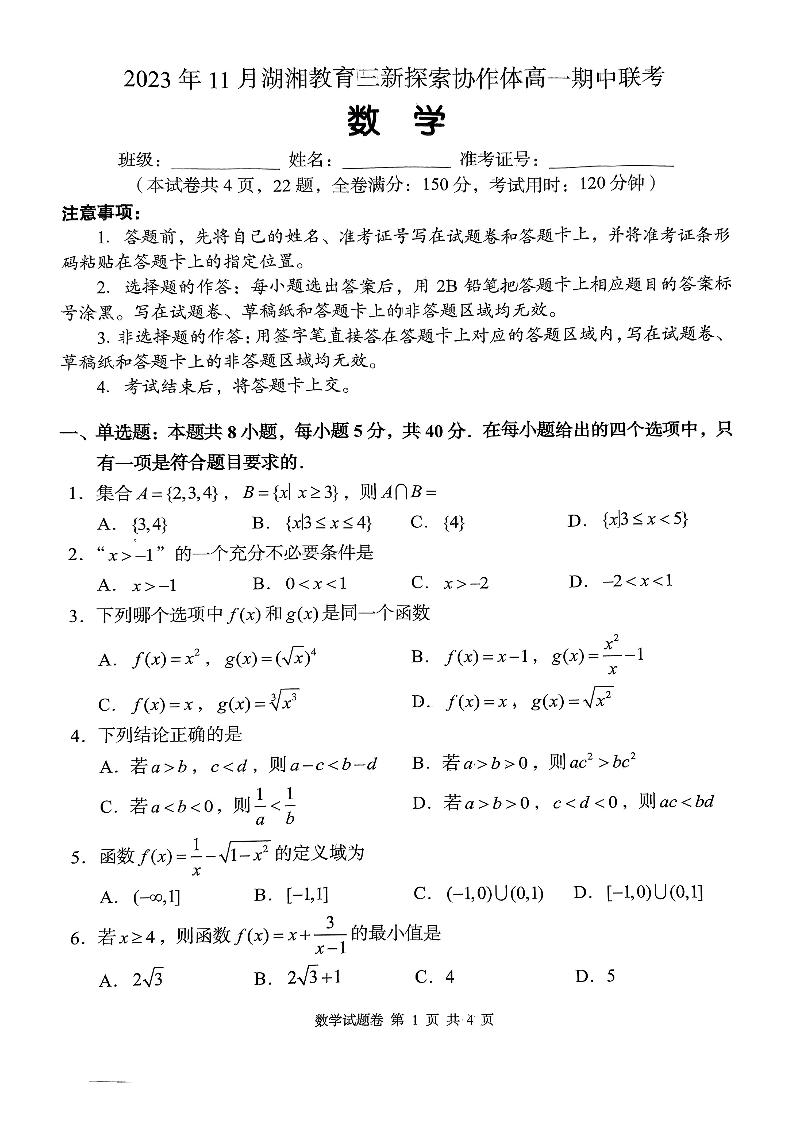 湖南省衡阳市湖湘教育三新探索协作体2023-2024学年高一上学期11月期中联考数学