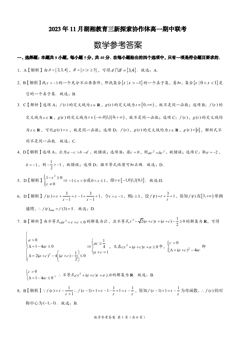 湖南省衡阳市湖湘教育三新探索协作体2023-2024学年高一上学期11月期中联考数学答案