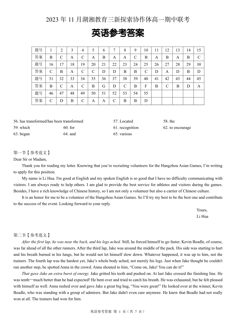 湖南省衡阳市湖湘教育三新探索协作体2023-2024学年高一上学期11月期中联考英语答案