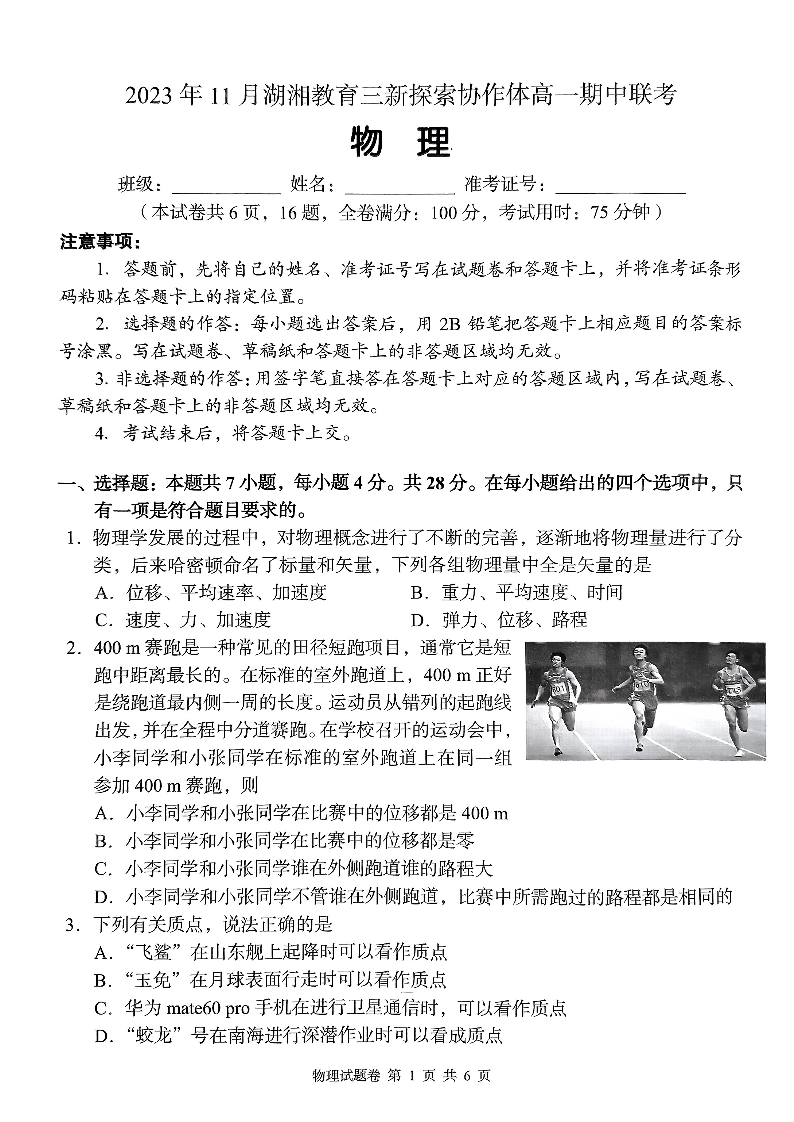 湖南省衡阳市湖湘教育三新探索协作体2023-2024学年高一上学期11月期中联考物理