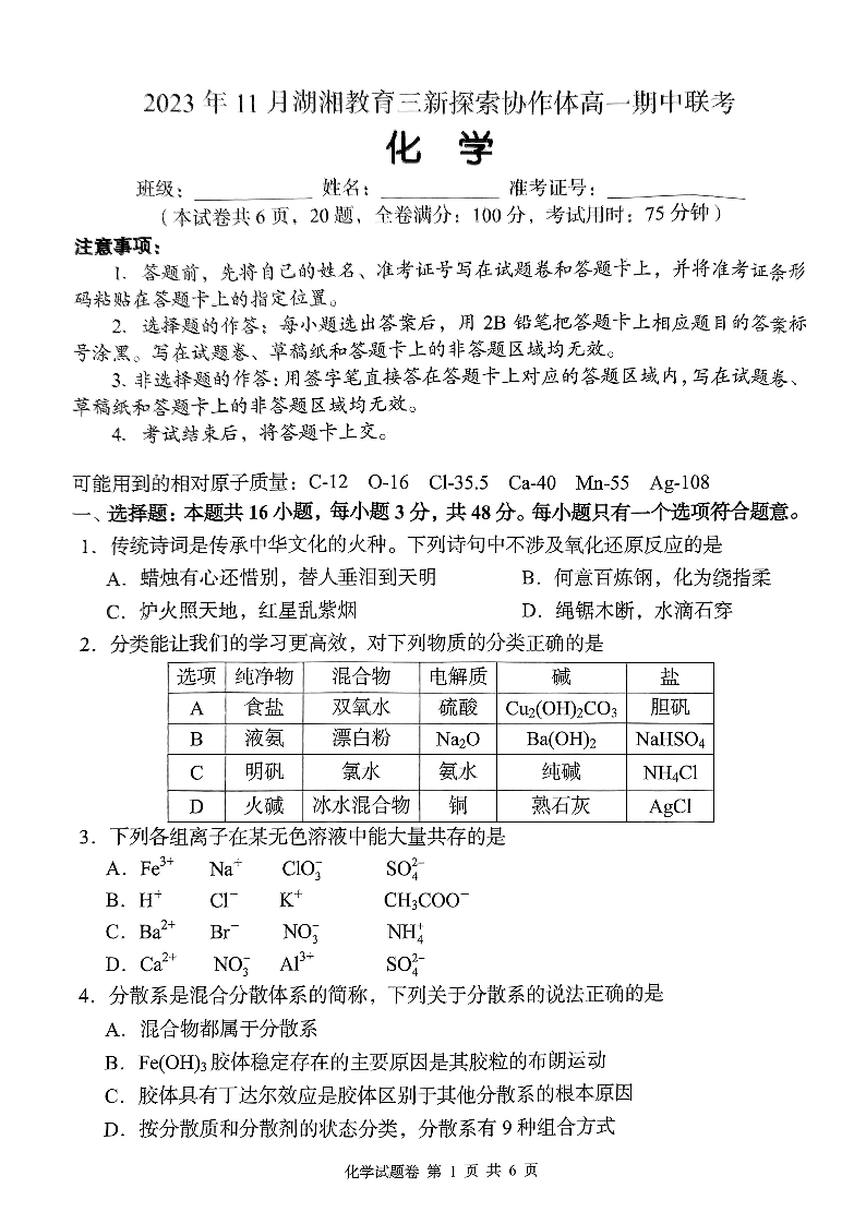 湖南省衡阳市湖湘教育三新探索协作体2023-2024学年高一上学期11月期中联考化学