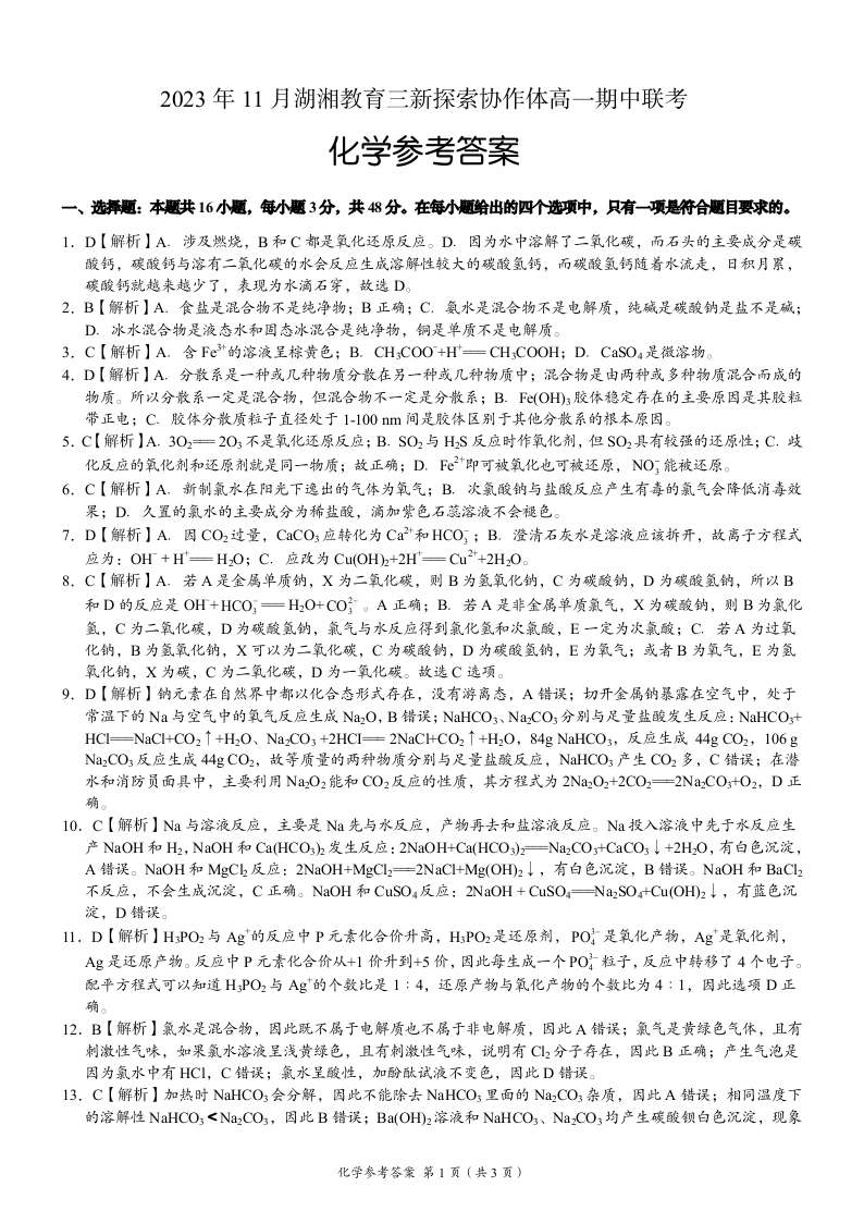 湖南省衡阳市湖湘教育三新探索协作体2023-2024学年高一上学期11月期中联考化学答案