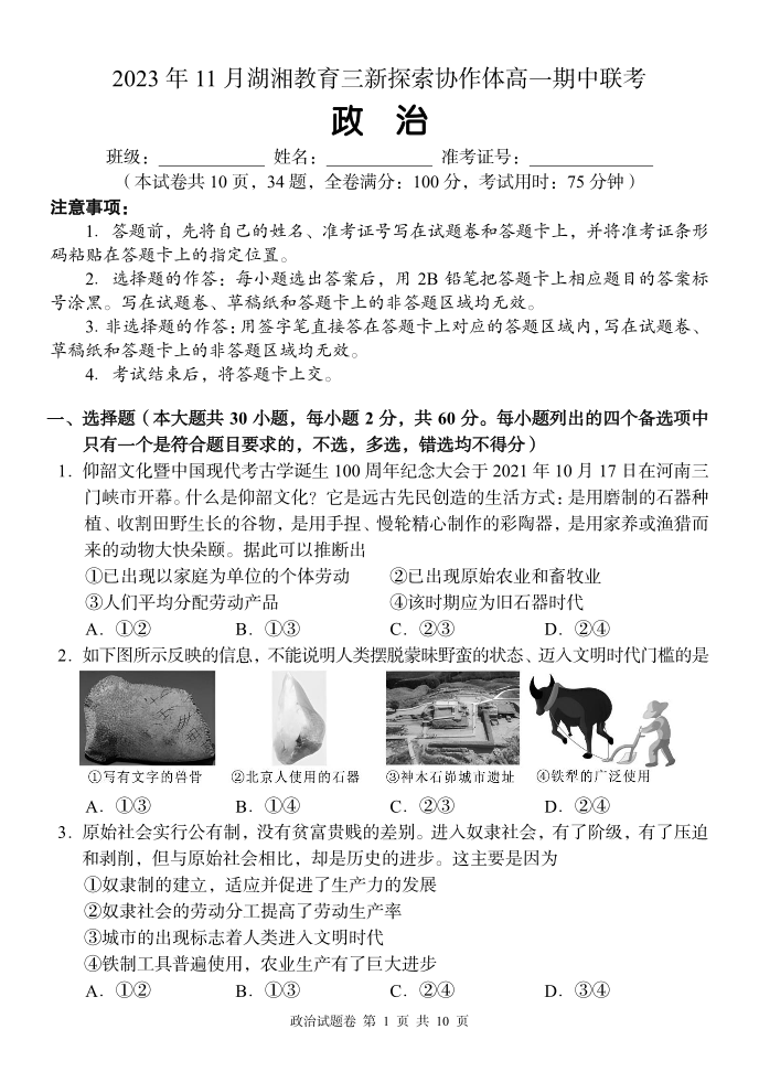 湖南省衡阳市湖湘教育三新探索协作体2023-2024学年高一上学期11月期中联考政治
