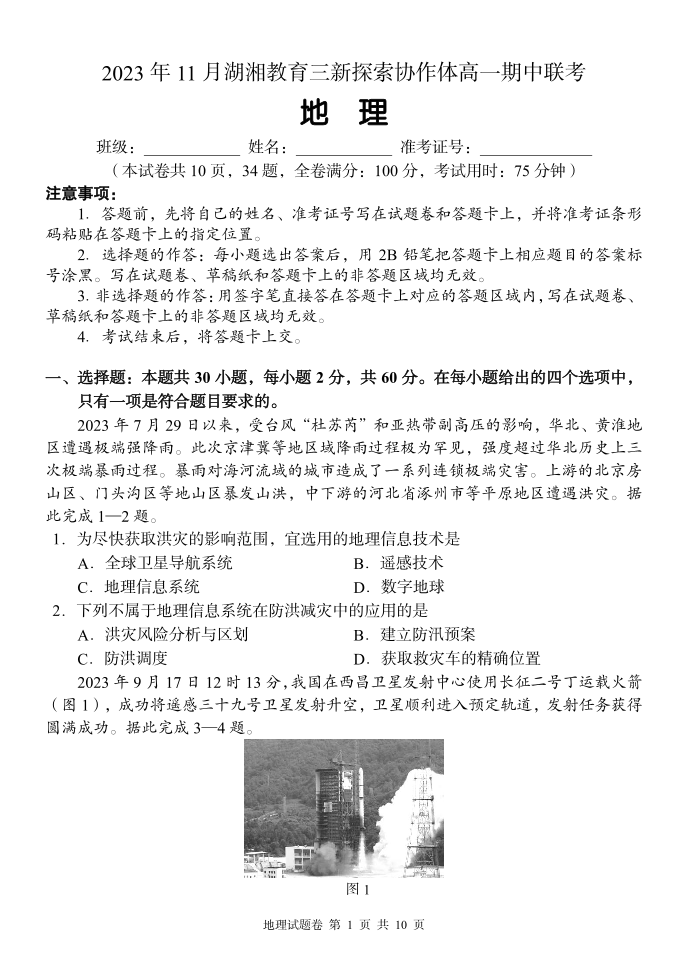 湖南省衡阳市湖湘教育三新探索协作体2023-2024学年高一上学期11月期中联考地理