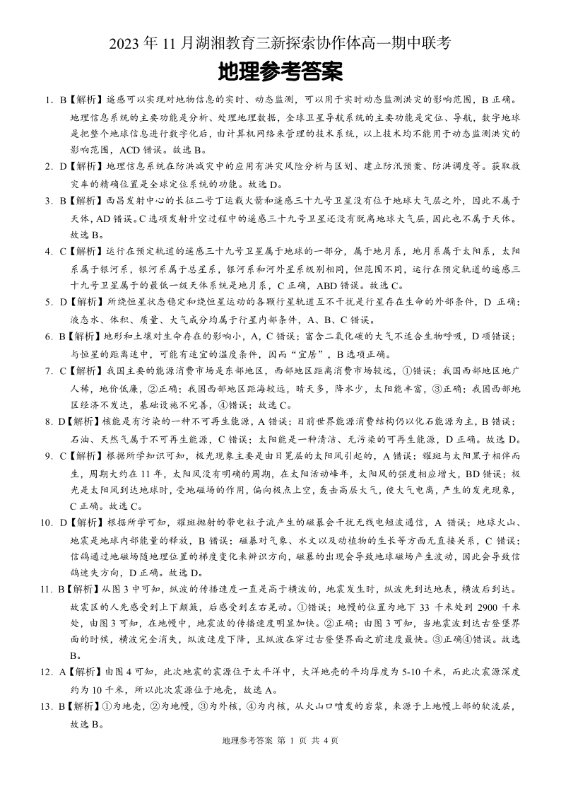 湖南省衡阳市湖湘教育三新探索协作体2023-2024学年高一上学期11月期中联考地理答案