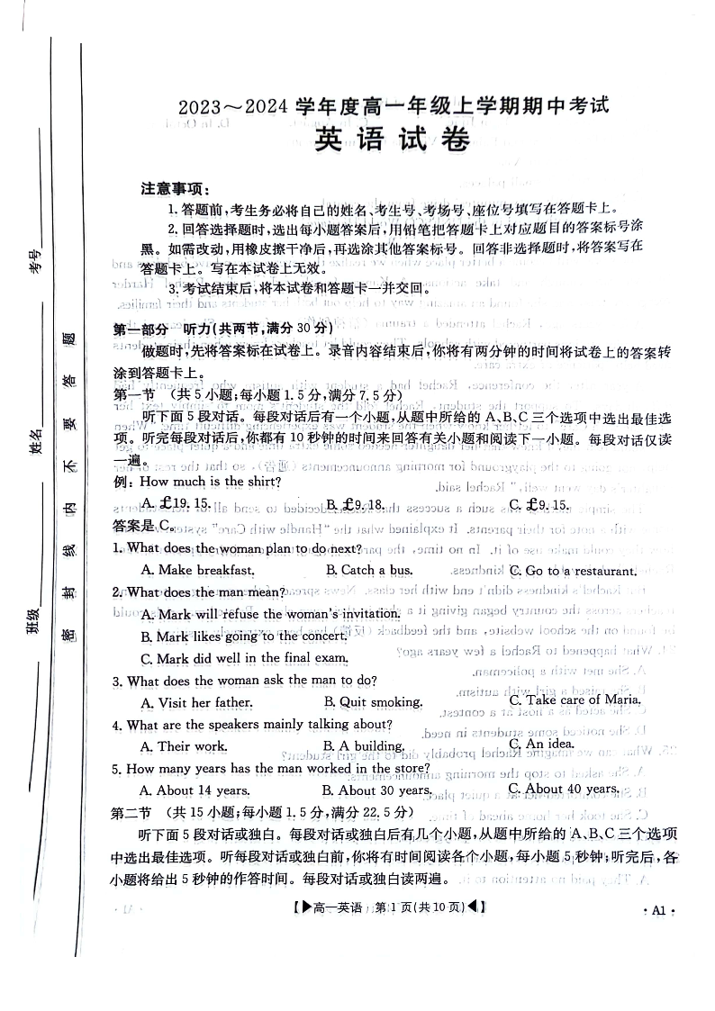 吉林省十一校联考2023-2024学年高一上学期期中考试英语