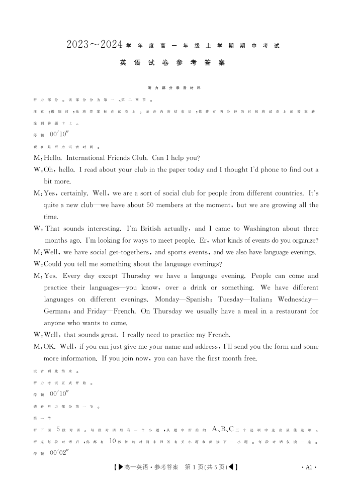 吉林省十一校联考2023-2024学年高一上学期期中考试英语答案