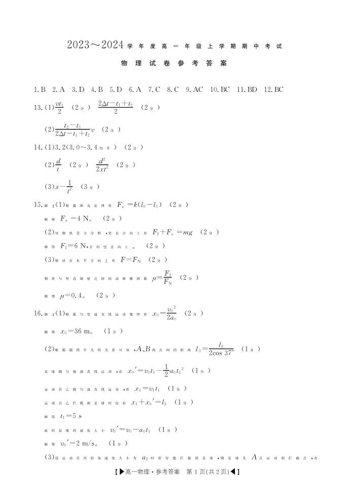 吉林省十一校联考2023-2024学年高一上学期期中考试物理答案