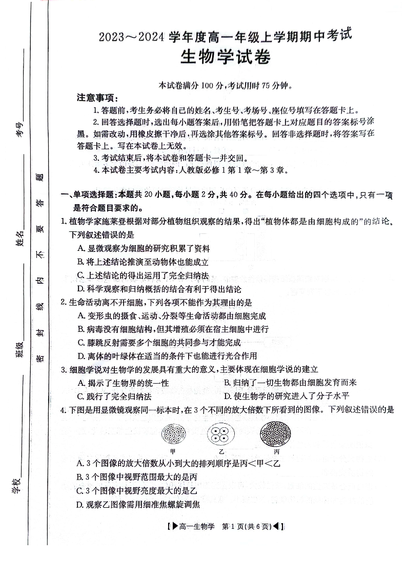 吉林省十一校联考2023-2024学年高一上学期期中考试生物