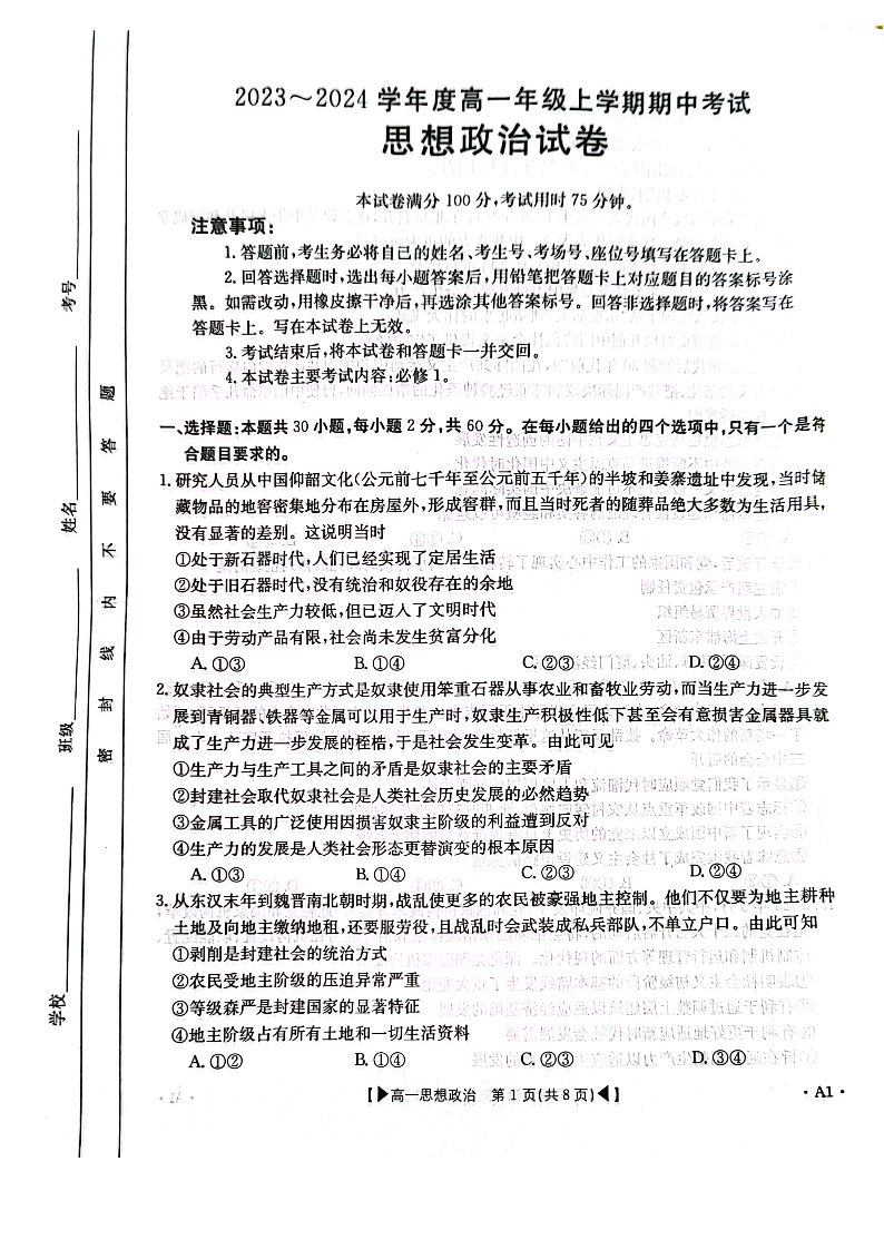 吉林省十一校联考2023-2024学年高一上学期期中考试政治