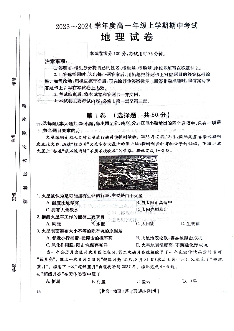 吉林省十一校联考2023-2024学年高一上学期期中考试地理