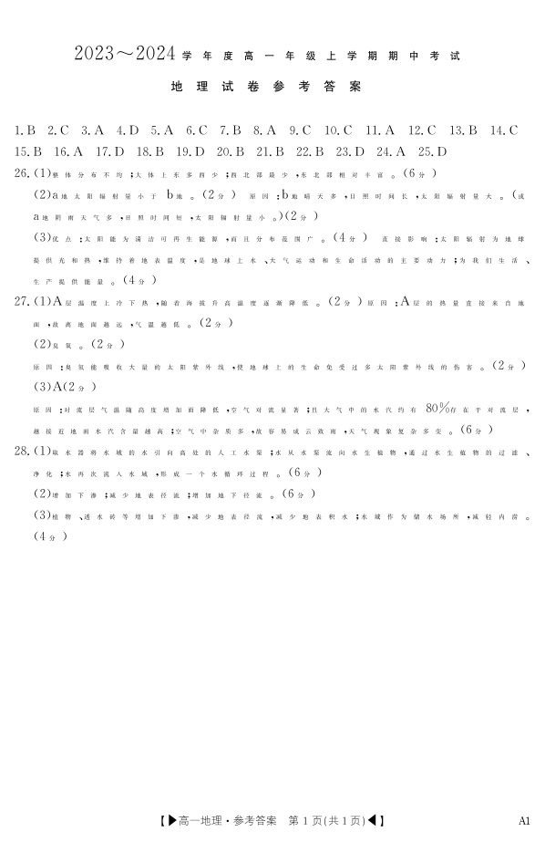 吉林省十一校联考2023-2024学年高一上学期期中考试地理答案
