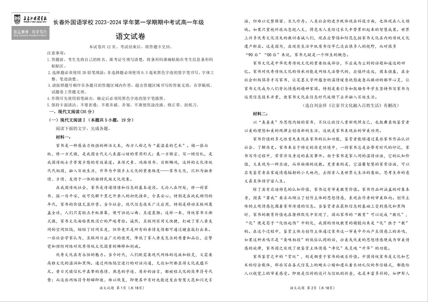 吉林省长春外国语学校2023-2024学年高一上学期11月期中考试语文+答案