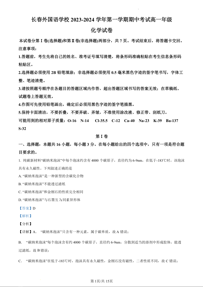 吉林省长春外国语学校2023-2024学年高一上学期11月期中考试化学(精品解析版)