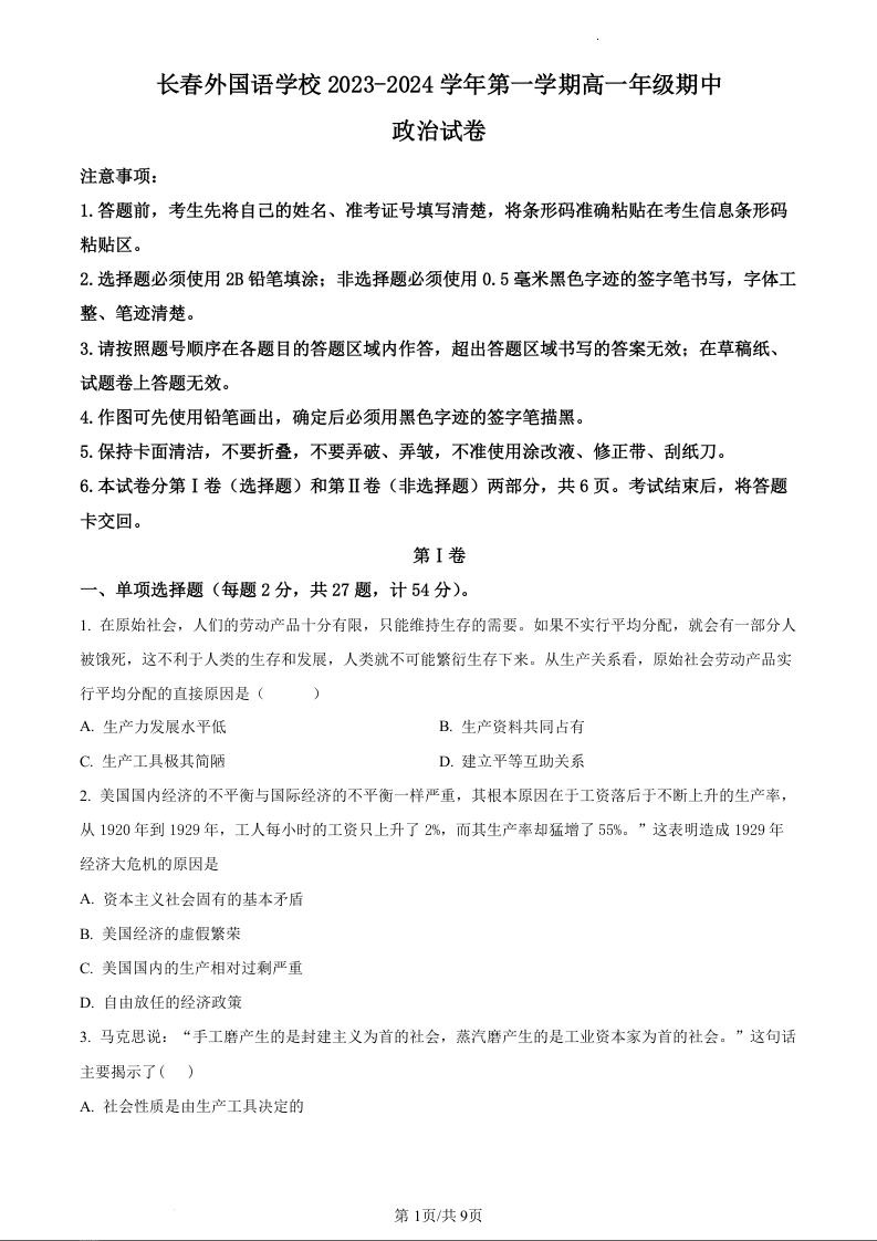 吉林省长春外国语学校2023-2024学年高一上学期11月期中考试政治(原卷版)