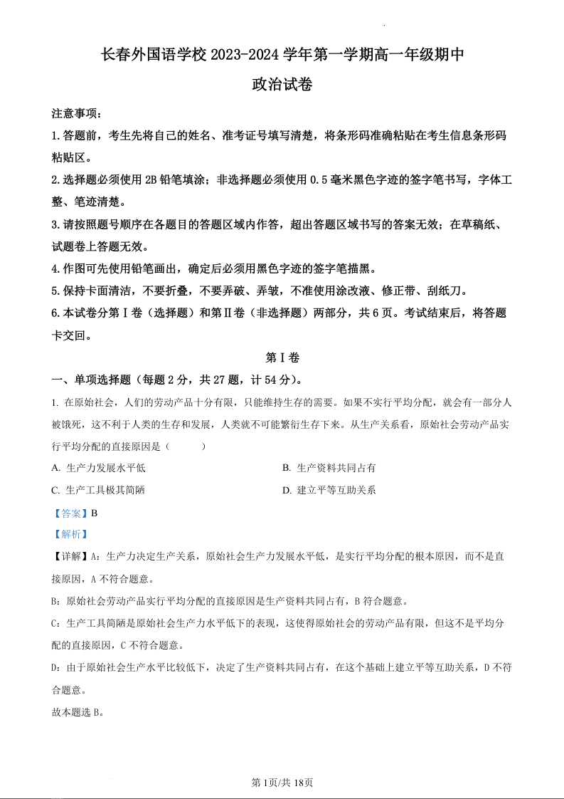 吉林省长春外国语学校2023-2024学年高一上学期11月期中考试政治(精品解析版)