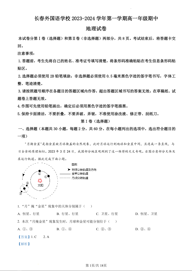 吉林省长春外国语学校2023-2024学年高一上学期11月期中考试地理(精品解析版)