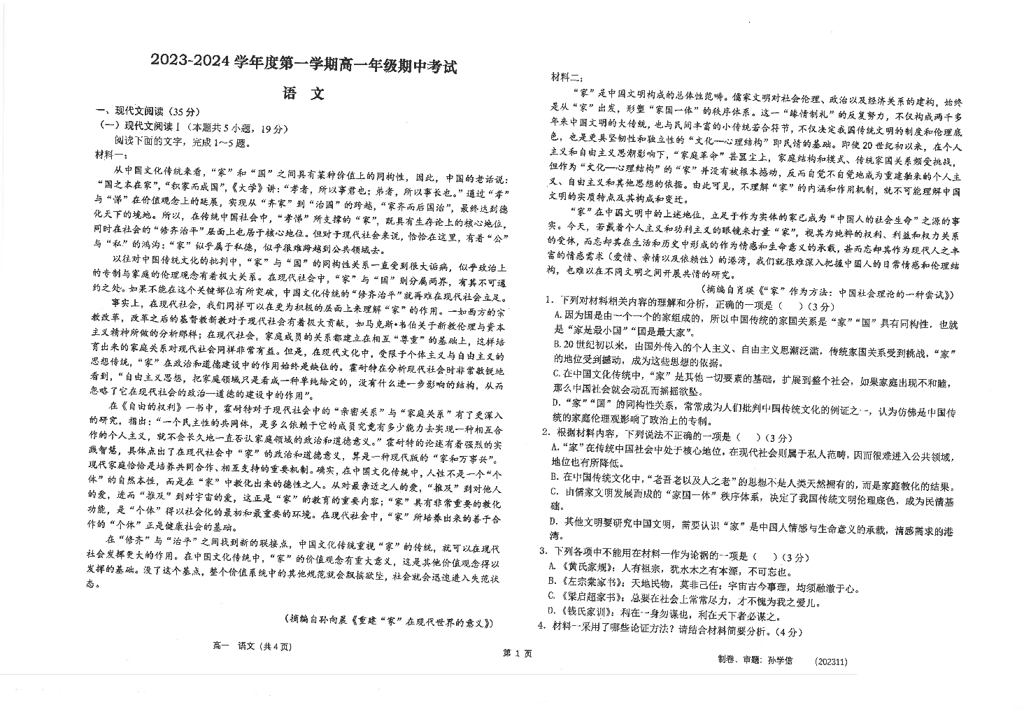 江苏省海安高级中学2023-2024学年高一上学期期中考试语文+答案