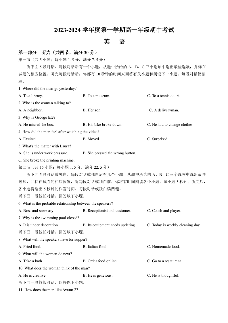 江苏省海安高级中学2023-2024学年高一上学期期中考试英语+答案