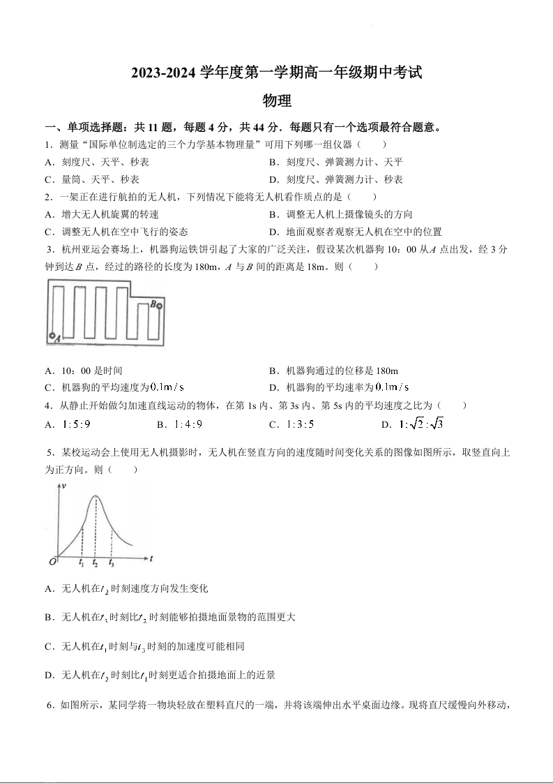 江苏省海安高级中学2023-2024学年高一上学期期中考试物理+答案