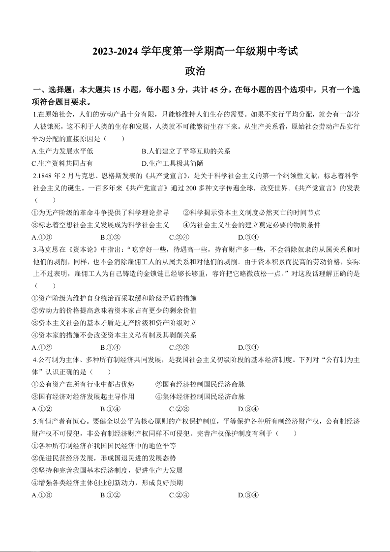 江苏省海安高级中学2023-2024学年高一上学期期中考试政治+答案