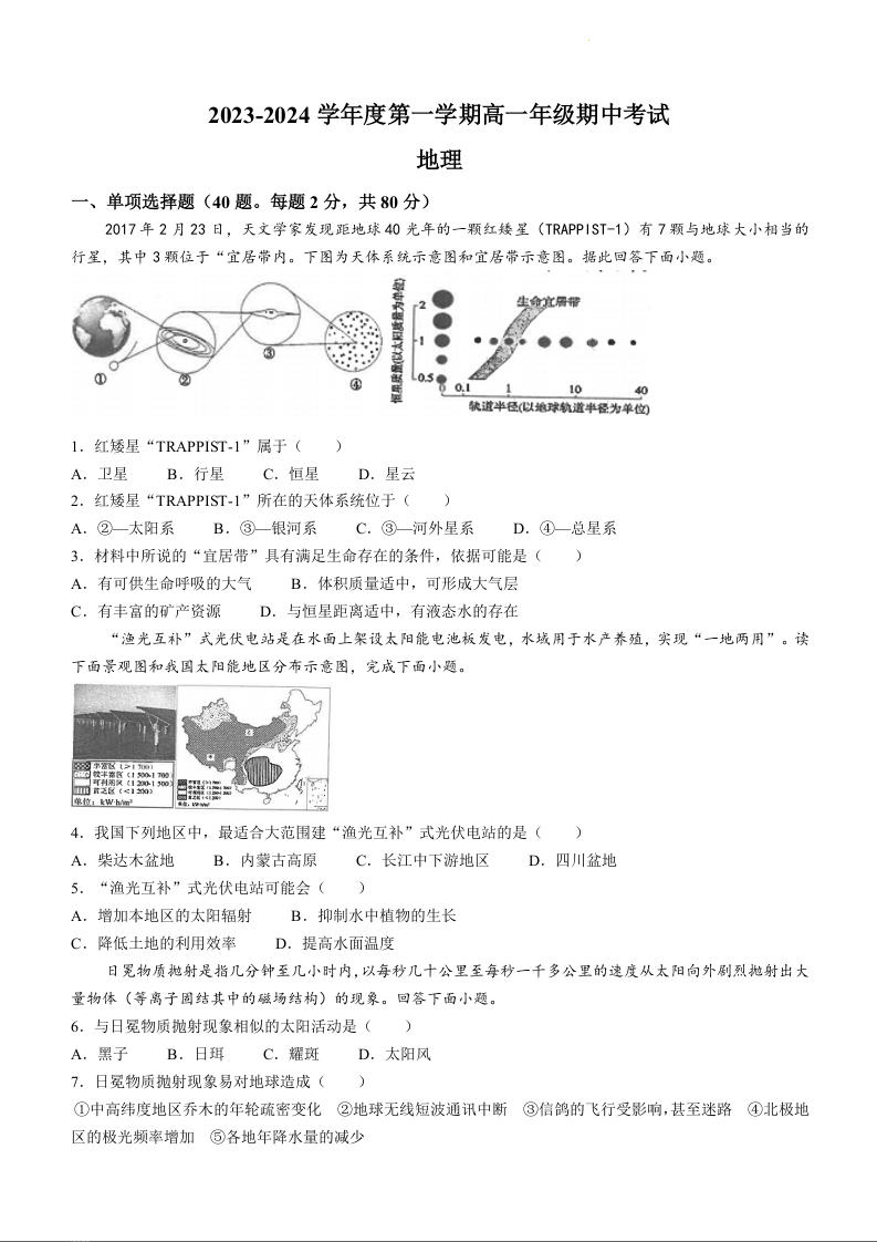 江苏省海安高级中学2023-2024学年高一上学期期中考试地理