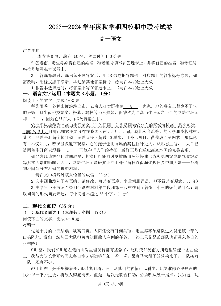 江苏省无锡市江阴市四校2023-2024学年高一上学期11月期中联考语文